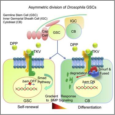 12月10日出版的《细胞》(Cell)杂志,发表了中科院动物研究所陈大华等的一项最新研究成果,研究人员发现干细胞的分化子细胞通过Fused/Smurf复合体主动地拮抗来自微环境的BMP信号,从而在干细胞和分化子细胞之间产生陡峭BMP响应梯度,进而促进干细胞不对称地分裂。